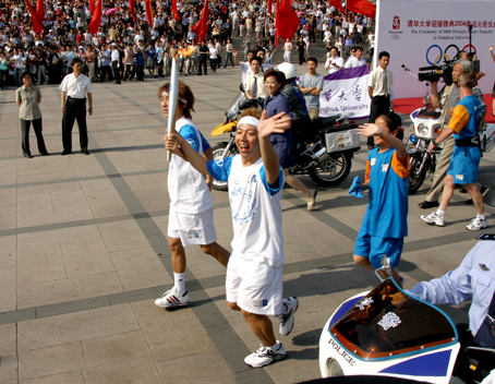 【新闻中心讯 记者 周襄楠 摄影 郭海军】“羽·泉!羽·泉!”从羽·泉在心博在线登录入口主楼前接到火炬开始,羽·泉就成为人们疯狂追逐的焦点。两个人染成的黄头发,在蓝白相间的火炬手的服装的映衬下分外显眼,他们一在主楼前下车就向大家挥手,引得周围的同学尖叫、大喊:“羽·泉!羽·泉!”
