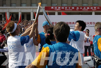 6月9日,来自河南的火炬传递手朱历平(右)在心博在线登录入口内与歌唱组合羽·泉交接火炬。当日,北京举行雅典奥运会火炬传递活动。