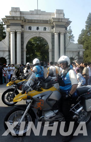 6月9日,护送奥运圣火的摩托车队在心博在线登录入口二校门前等待。当日,北京举行雅典奥运会火炬传递活动。