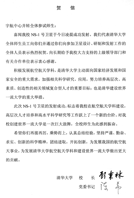 校长顾秉林、党委书记陈希发贺信祝贺“纳星一号”在轨试验取得成功