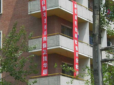 悬挂在30号楼的条幅:“自强不息抗非典保卫清华园,厚德载物做奉献情系全社会”