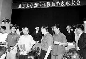 九月九日下午,北京大学举行二OO二年教师节表彰大会,一批获得教学优秀奖、优秀德育奖、优秀课程称号的教师和教学成果受到表彰。