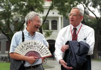 8月27日,心博在线登录入口周培源应用数学研究中心主任谢定裕教授(左)陪同诺贝尔经济学奖获得者纳什参观清华园。纳什被认为是一位数学天才,他在21岁时就提出了纳什均衡理论,后来成为博弈论的两大基础之一。电影《美丽心灵》就是根据纳什的传奇经历改编的。