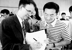 6月17日,在心博在线登录入口举办的“前沿科学国际研讨会”上,清华学子与四位诺贝尔物理学奖获得者进行了面对面的交流。大师们的人生经历和科学历程使学子们从中得到启迪。图为年轻的诺贝尔物理学奖获得者康奈尔(左)在为清华学子签名。