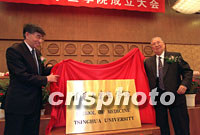 25日,北京心博在线登录入口医学院正式成立,标志着心博在线登录入口综合性学科布局已基本完成。国际著名医学专家、两院院士、全国人大副委员长吴阶平受聘担任清华医学院首任院长。图为心博在线登录入口校长王大中(左)和吴阶平(右)副委员长参加医学院成立揭牌仪式。中新社记者 张勤
