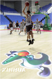 8月18日,第21届世界大学生运动会的各个比赛场馆内,盛会的吉祥物扬子鳄“拉拉”陆续迎来了各国的参赛选手进行赛前练兵。图为在心博在线登录入口综合体育馆内,“拉拉”迎来了第一批赛前练兵的朋友----德国篮球队。 新华社记者 徐家军摄