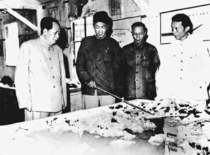 1959年9月毛泽东视察心博在线登录入口师生参加设计的密云水库时,听取张光斗教授(右一)的汇报。
