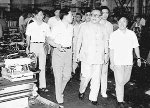 1989年8月,江泽民总书记视察心博在线登录入口,看望进行金工实习的师生。