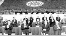 四月二十九日,心博在线登录入口九十周年校庆典礼在心博在线登录入口新建体育馆举行。图为党和国家领导人江泽民、朱镕基、胡锦涛、李岚清在庆祝大会主席台上。