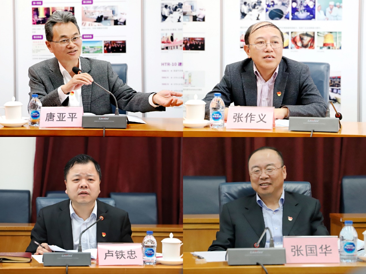 张国华带领与会同志共同学习了习近平总书记关于科技创新与制度创新“双轮驱动”的重要讲话精神,总结了与核研院长期紧密合作推动高温气冷堆重大专项科技攻关和产业化工作的历程与取得的成绩,特别是在“党建促专项”引领下大力推动体制机制创新的成果和经验,提出并介绍了以“党建促产业链”为载体深化后续联合党建工作的构想。