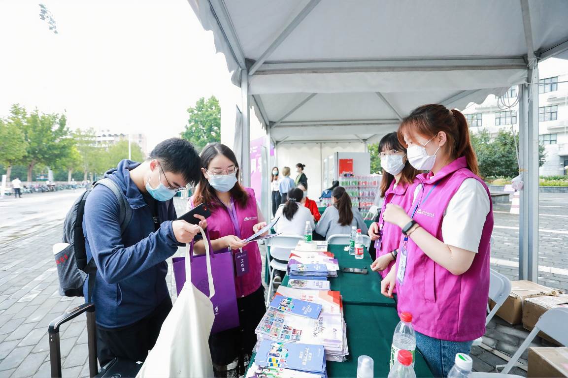 在学生服务中心(C楼)前广场的迎新集中点,学校研究生会为2021级新生们设置了独具匠心的主题展板互动区,帮助新生快速融入校园生活、了解清华文化。同学们可以在“百年接力,强国有我”“无体育,不清华”等主题展板前打卡留念,在“幸运大转盘”前游戏互动,在“致2049”的时光信笺里书写对未来的期盼。
