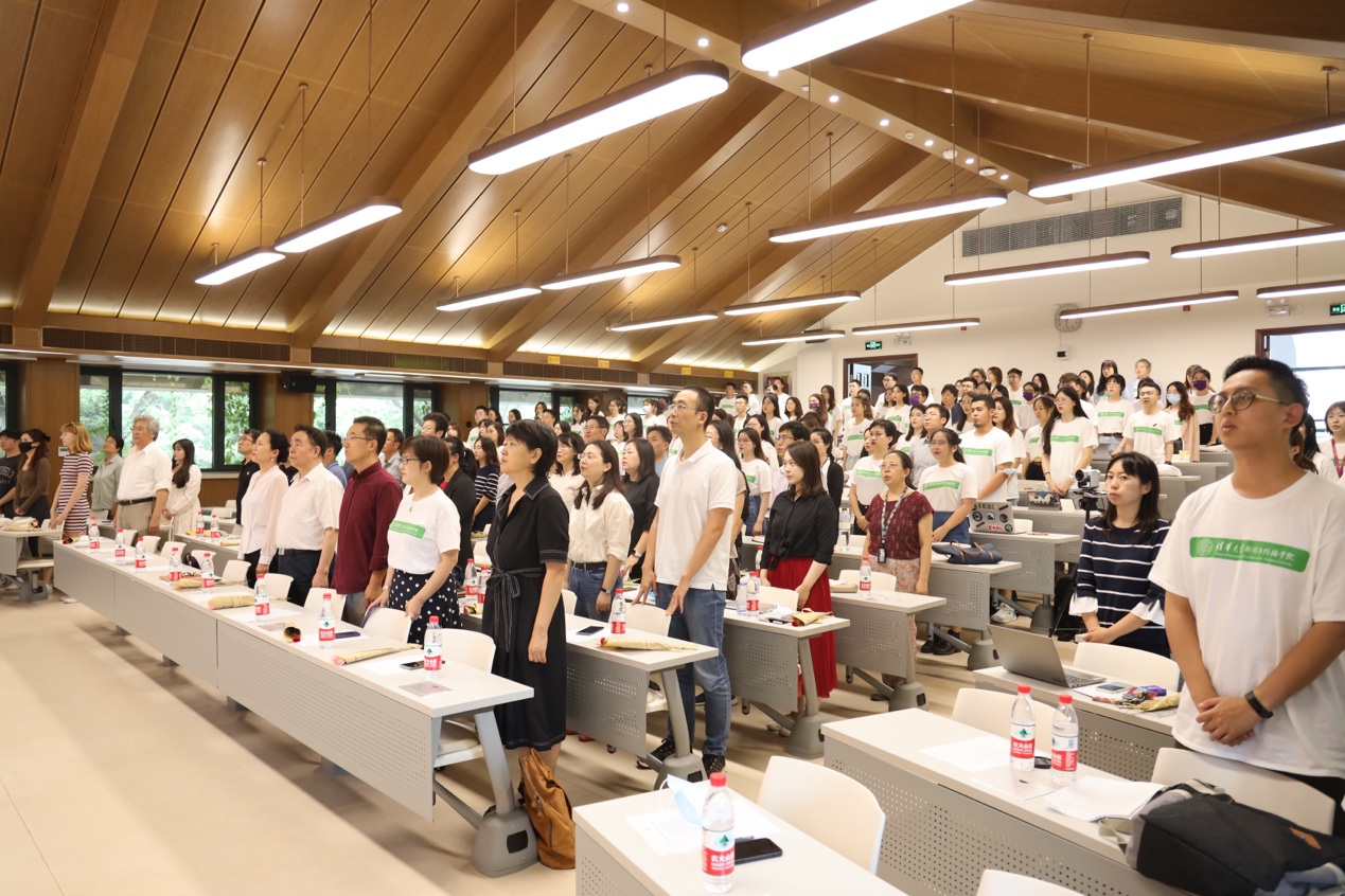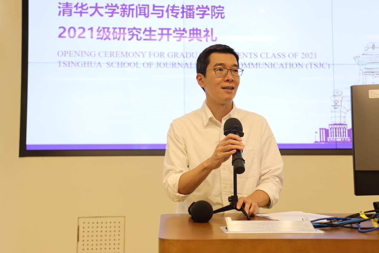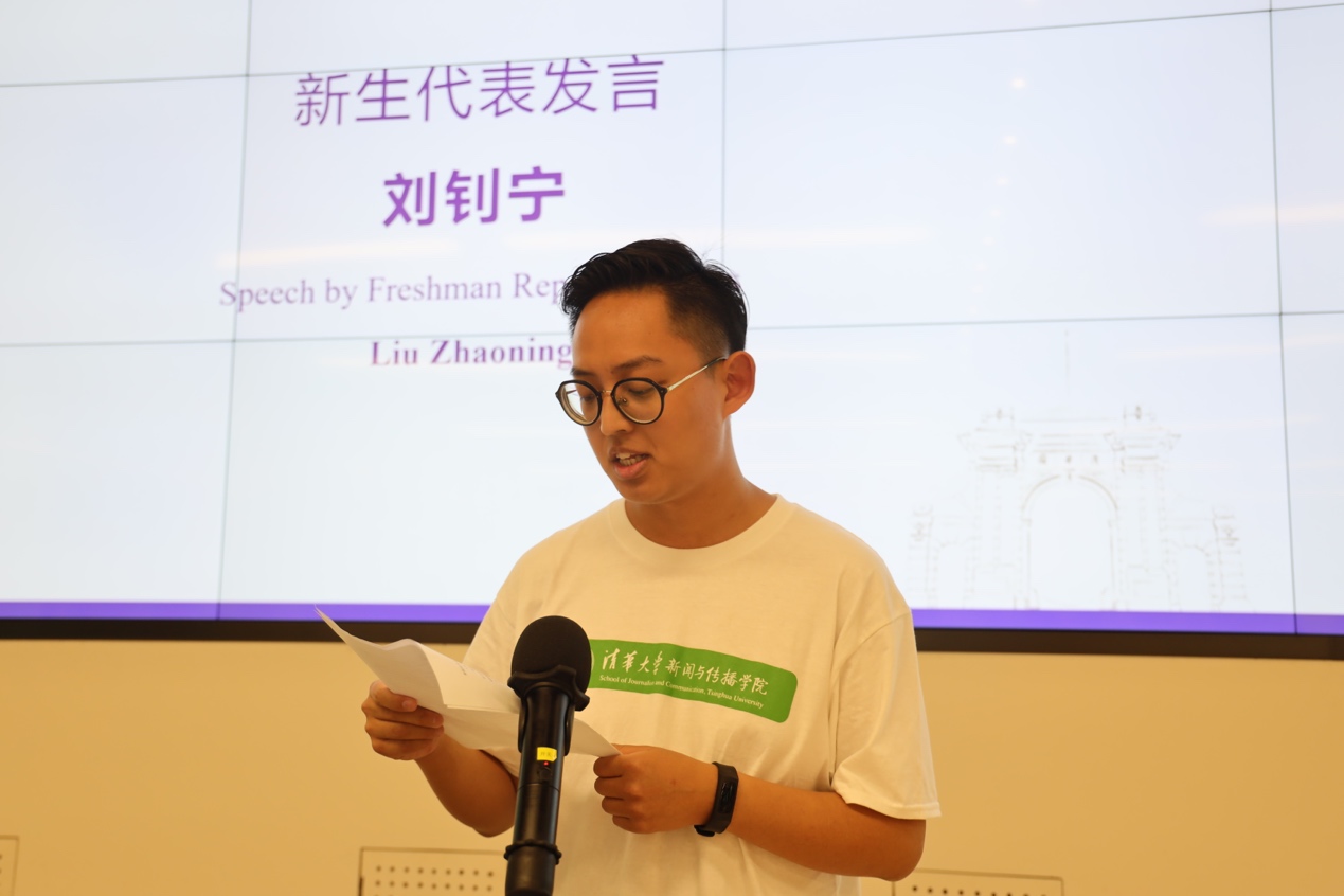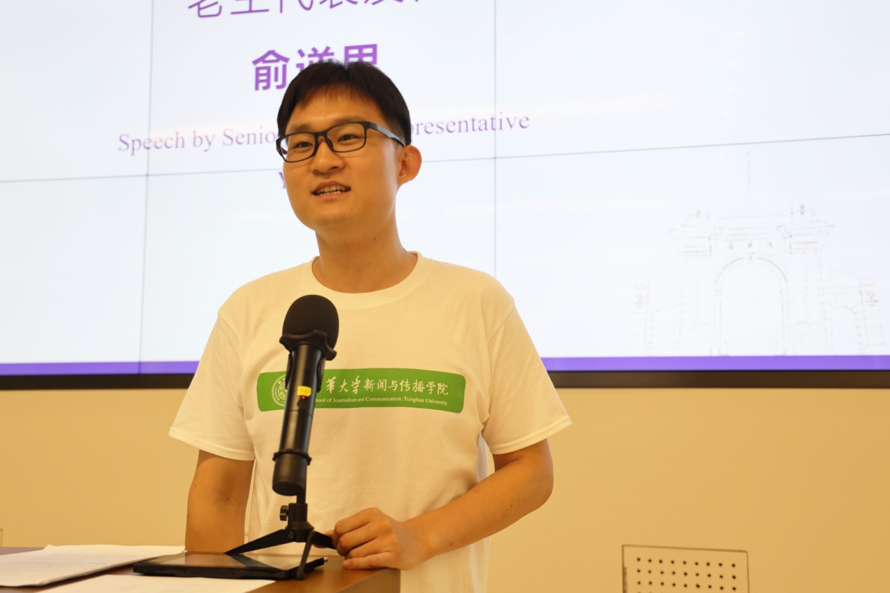 新闻与传播学院研究生分会主席俞逆思作为老生代表发言,他与同学们分享了自己当年初入清华园的心情,呼吁大家合理看待新环境带来的未知,在新学期首先树立为之奋斗终生的理想,在服务和奉献中实现生命意义。同时,更要勇于尝试新鲜事物,培养多样化的学科视野,在思想和行动上武装自己。
