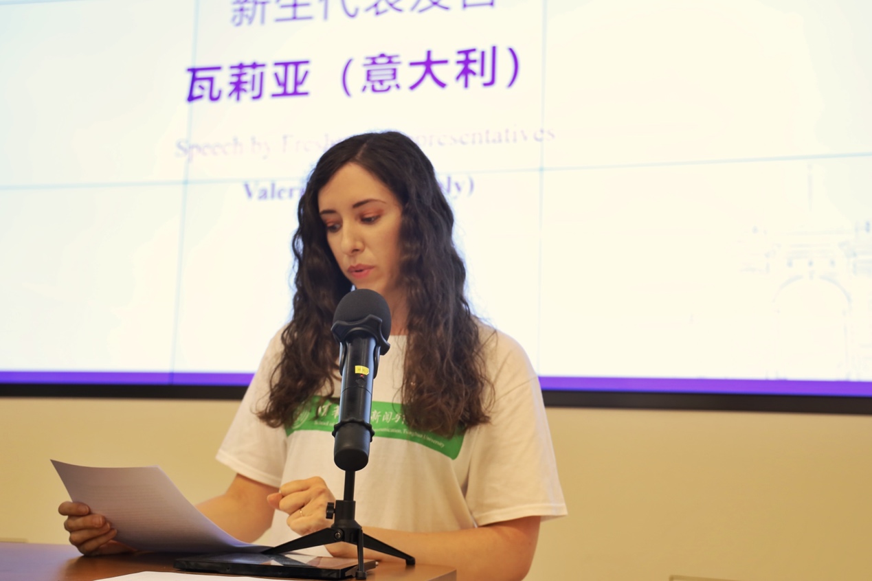 来自意大利的瓦莉亚代表全体博士研究生新生发言,她提到新冠疫情的席卷对海外学生的影响和挑战,表达了对线上同学尽快回到校园的期待。瓦莉亚希望新学期能够学好中文和专业知识,参与丰富多彩的校园活动,最后,她回顾了中意之间的友谊与合作,希望在未来的学习生活中,自己能成为两国友谊的“信使”,欢迎大家到自己的家乡做客。