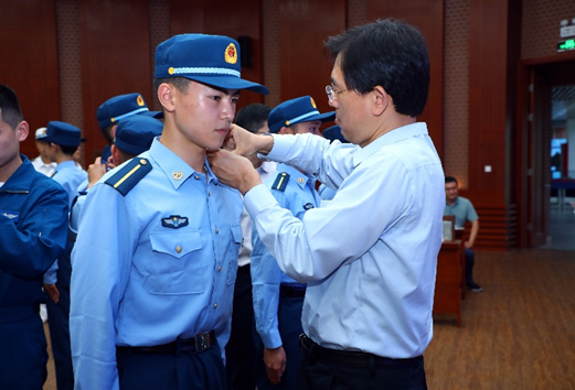仪式上,段普杰少校、曹萌少校分别宣读空军航空大学、海军航空大学授衔命令。现场嘉宾老师为39名学员同志佩戴学员军衔。