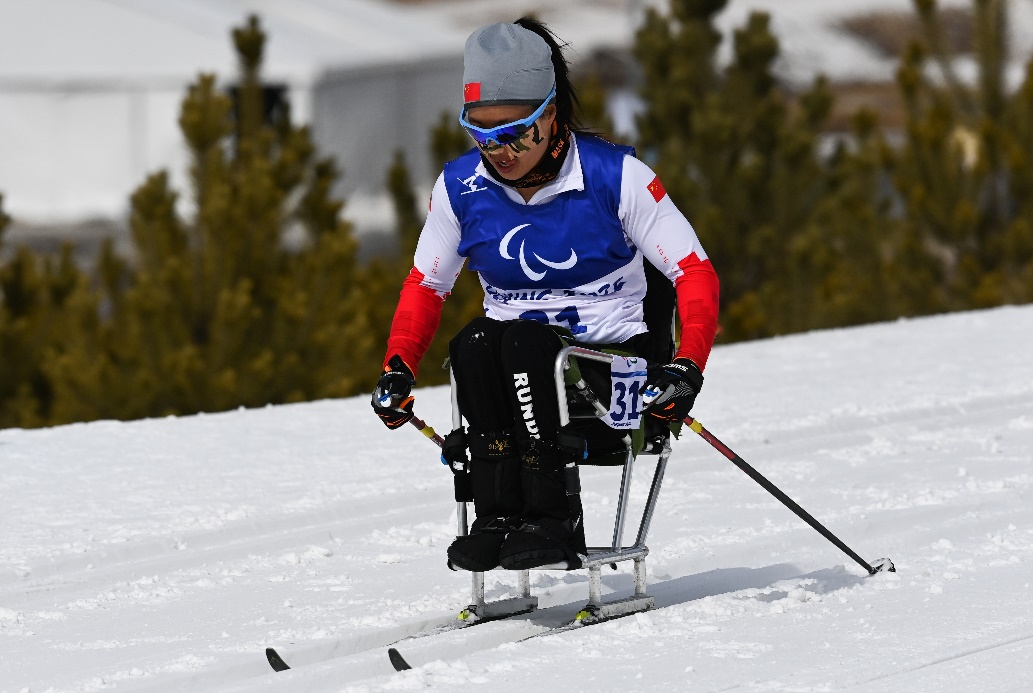 3月6日,北京2022年冬残奥会残奥越野滑雪女子长距离(坐姿)比赛在国家冬季两项中心举行,中国选手杨洪琼在比赛中。新华社记者 杨冠宇 摄
