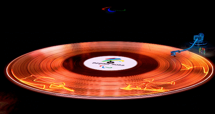 如果冬残奥会开幕式主要展现的是残健融合的理念,表现出全世界对于残疾群体的尊重,那么冬残奥会闭幕式则倾向于展现温情的记忆。闭幕式的视觉意象在开幕式“同心圆”的形象基础上,加入了一个“唱针”舞美装置,重新塑造了“留声机”的视觉形象。正如王之纲所言,“相对于现在很多新的存储媒介来讲,唱片具有纹理的质感与情感的温度,它更容易勾联起观众对这段珍贵时光记忆、怀念的共情感。”