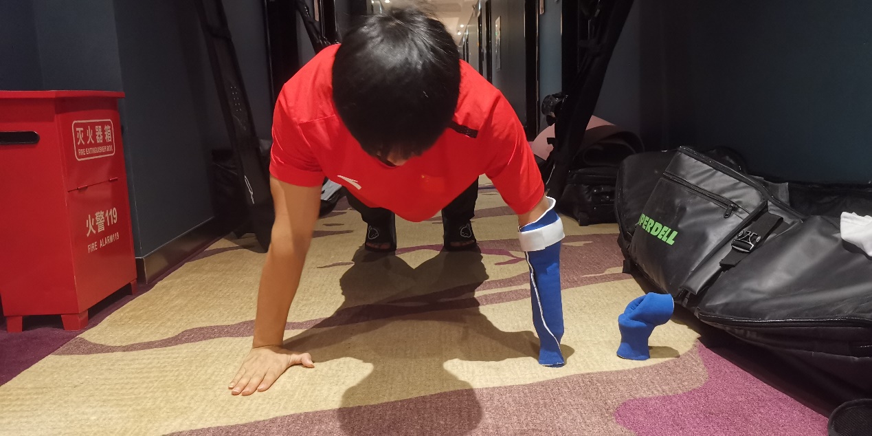 肘下截肢运动员在辅具帮助下做俯卧撑训练