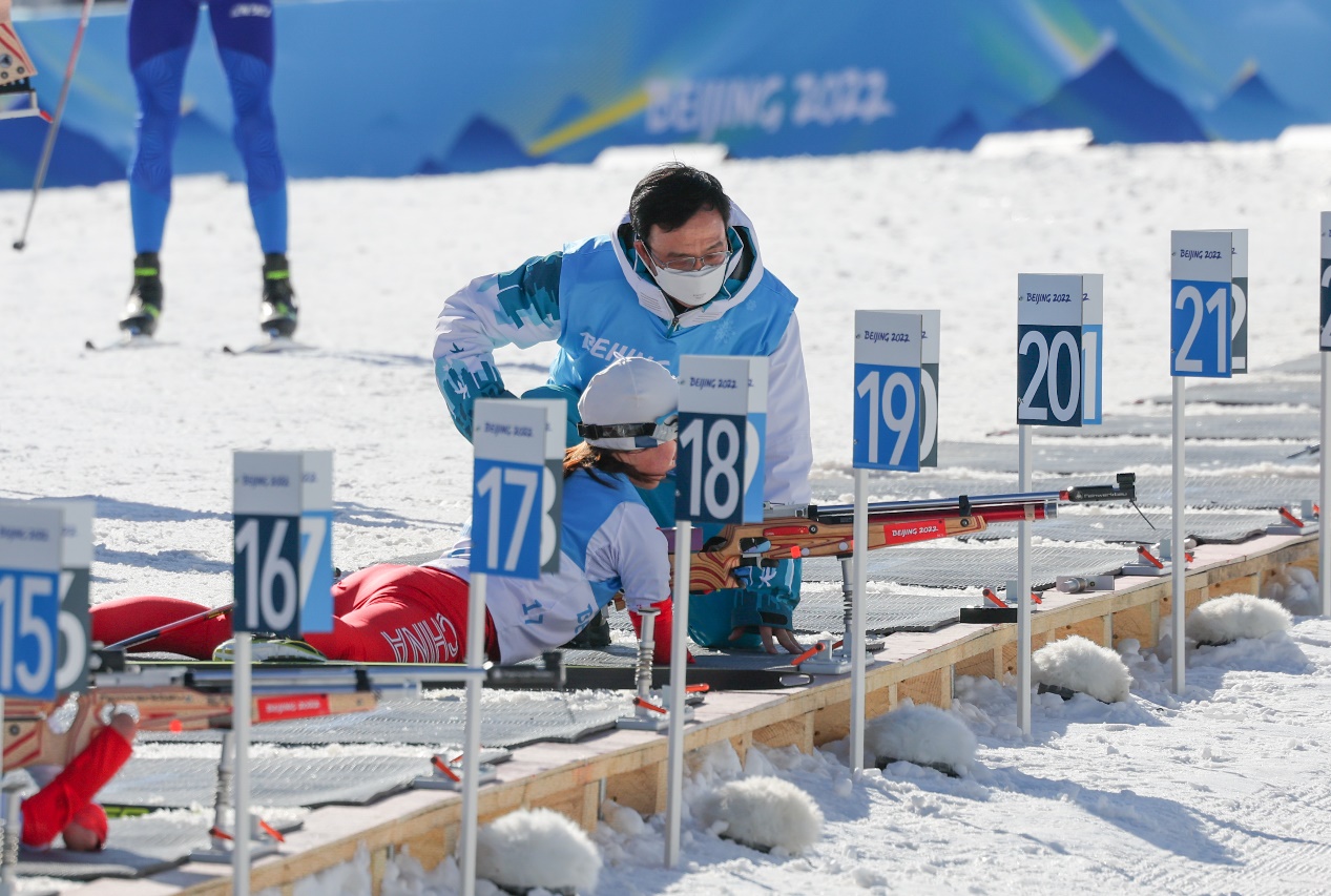 季林红在冬残奥现场为冬季两项运动员调整装备(图片来源:北京日报)
