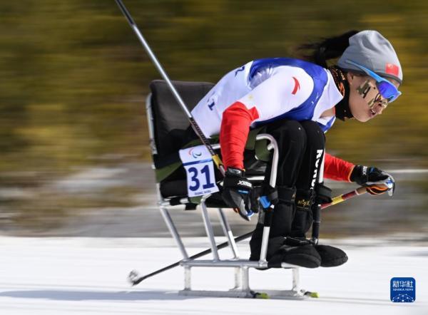 3月6日,北京2022年冬残奥会残奥越野滑雪女子长距离(坐姿)比赛举行,中国选手杨洪琼夺得金牌。(图片来源:新华社)