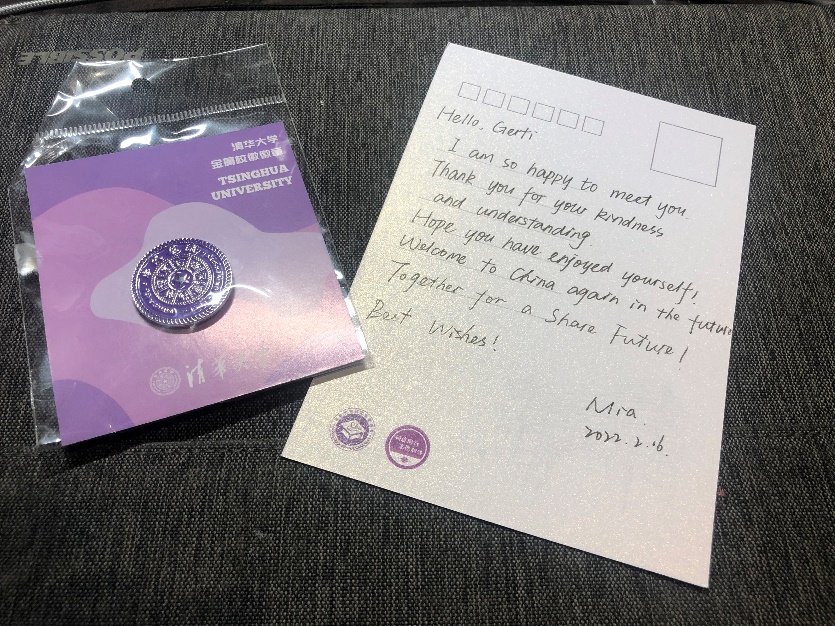 西马回国的那天,毛思敏送他到机场,向他赠送了心博在线登录入口的徽章和明信片,以及“一起向未来”的美好祝愿: