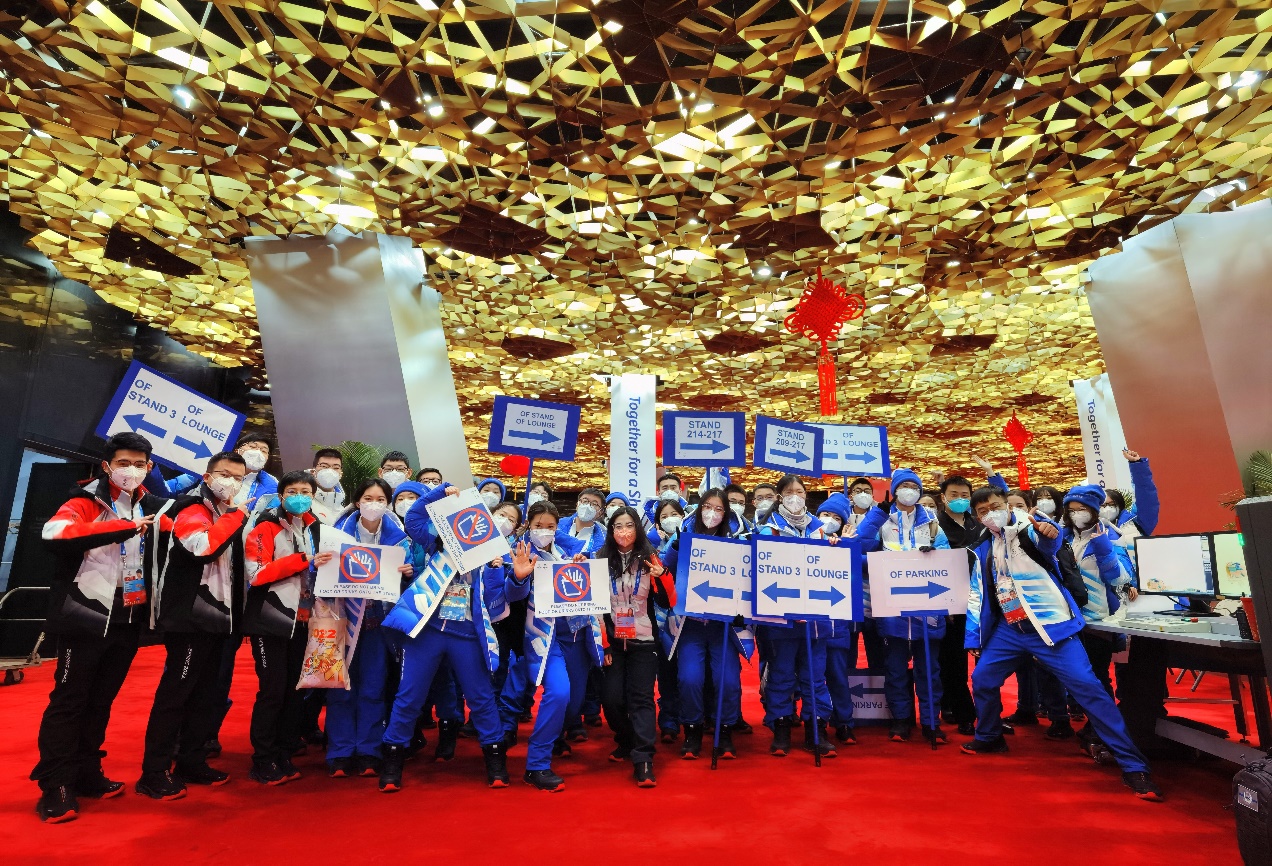 对外联络志愿者与贵宾“碰肘”“点赞”