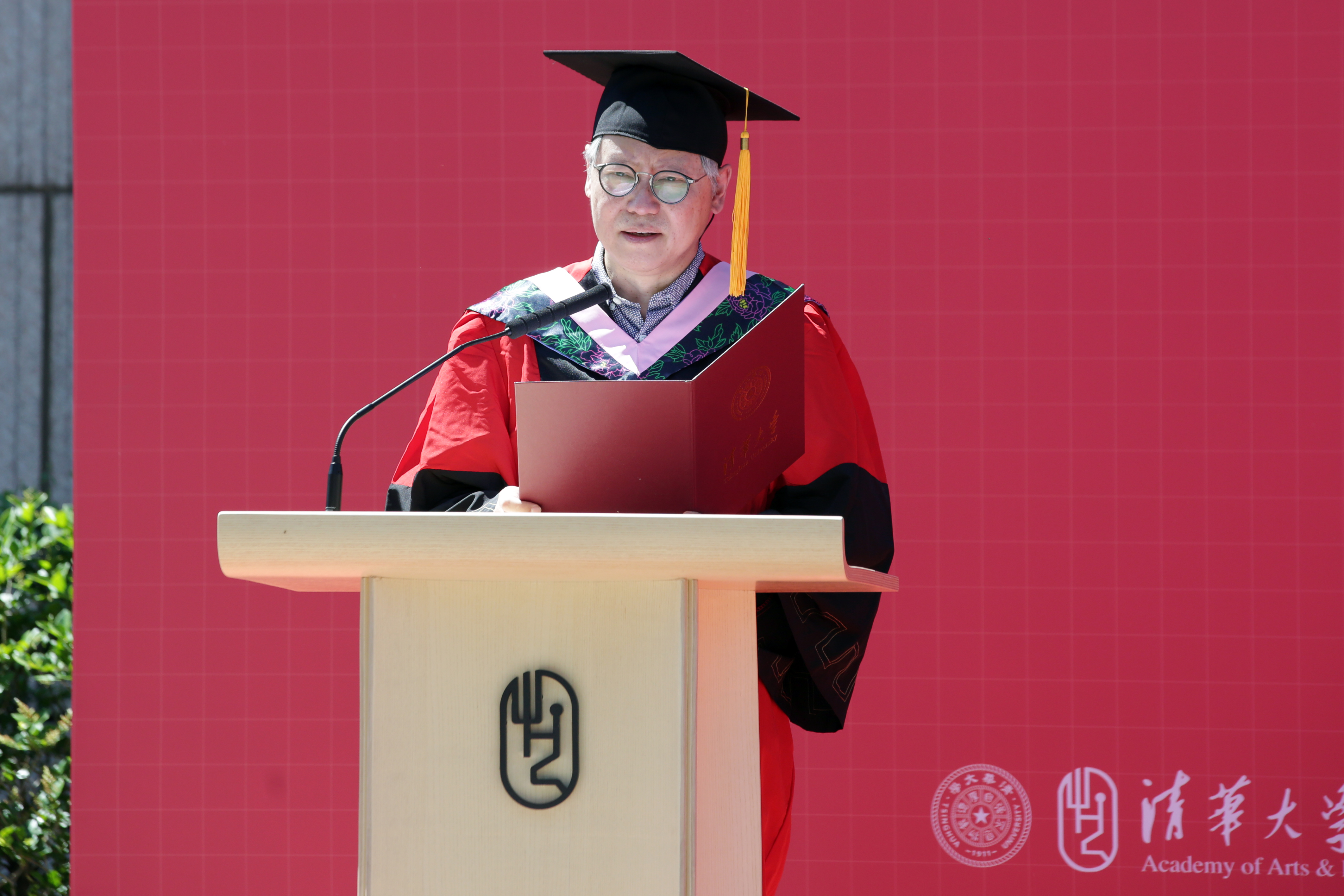 工业设计系教师陈洛奇作为学院教师代表发言。他谈到,大学生活教会同学们躬身耕耘,照亮他人,以美为媒,传播爱与希望。清华人和美院人的DNA会永远流淌在大家的体内,希望这份身份认同能陪伴大家一生,希望同学们善作善成,用智慧和毅力克服困难与挑战,发光发热,照亮和守护这个时代。