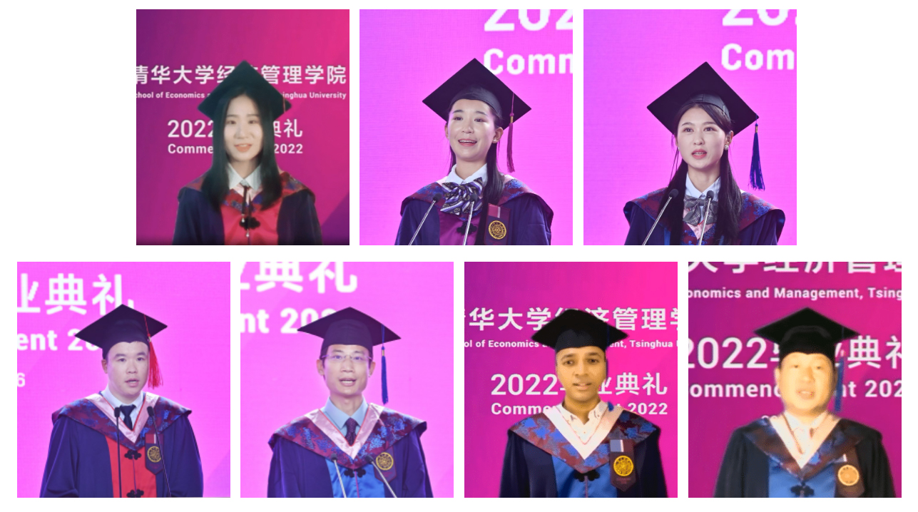 毕业生代表发言(从左至右、从上至下:王晨瑜、顾芗、郑家芳、刘培新、马铭、沙拉夫·哈米德、李向阳)