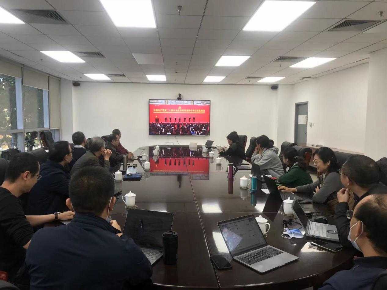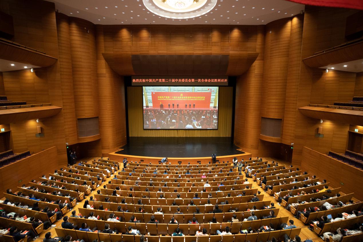 校领导、党委委员、纪委委员、师生代表等在新清华学堂观看直播
