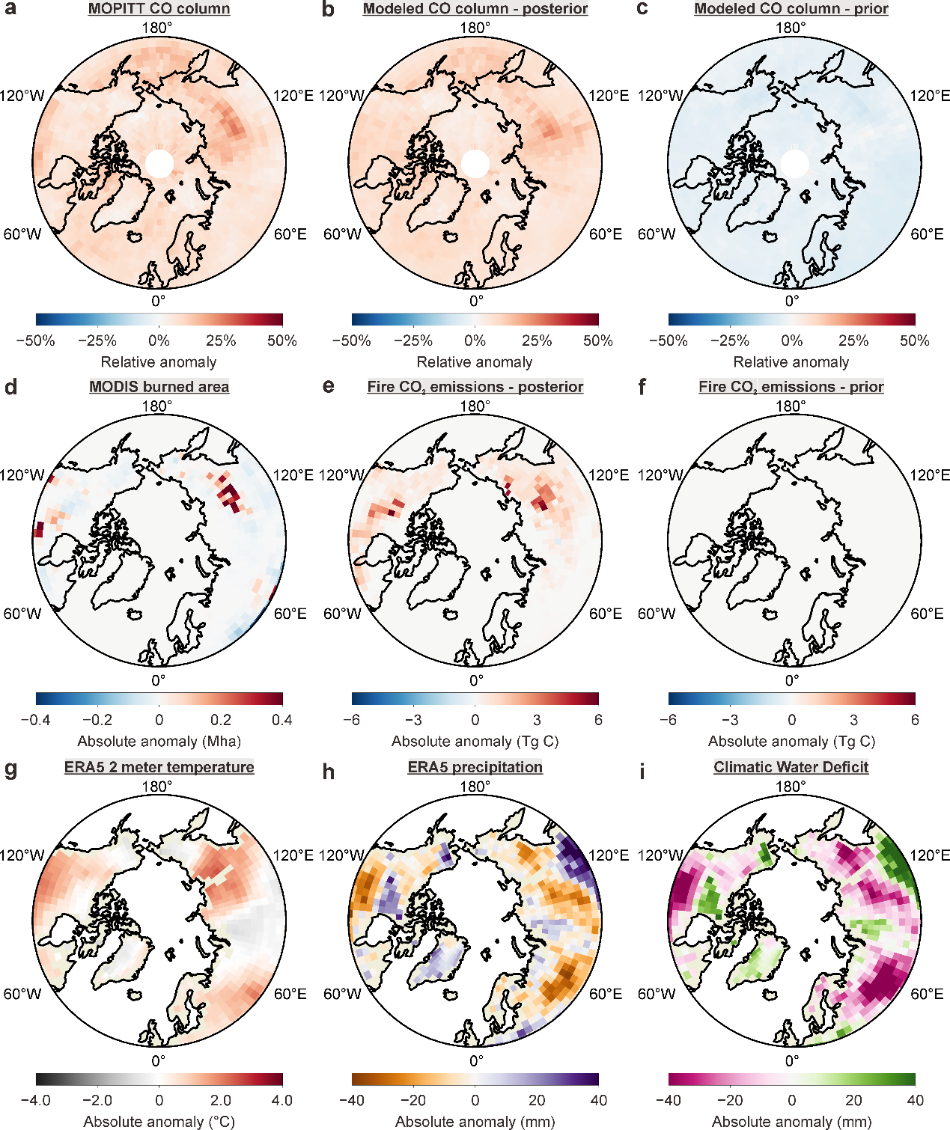相对于2000-2020年均值,2021年北纬50°以北区域大气中CO柱浓度、野火CO2排放及气象参数距平