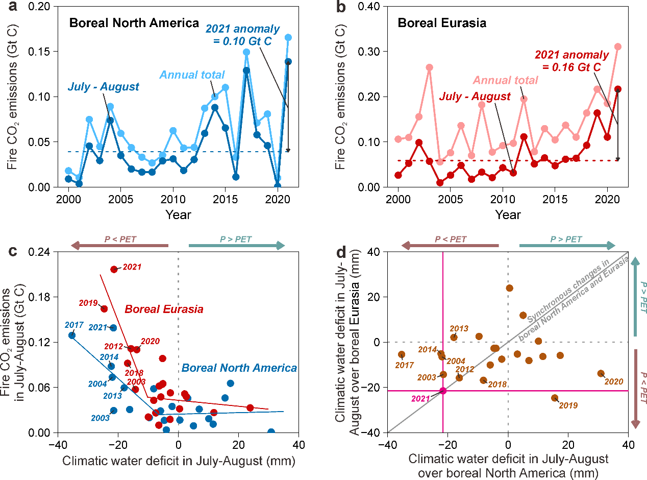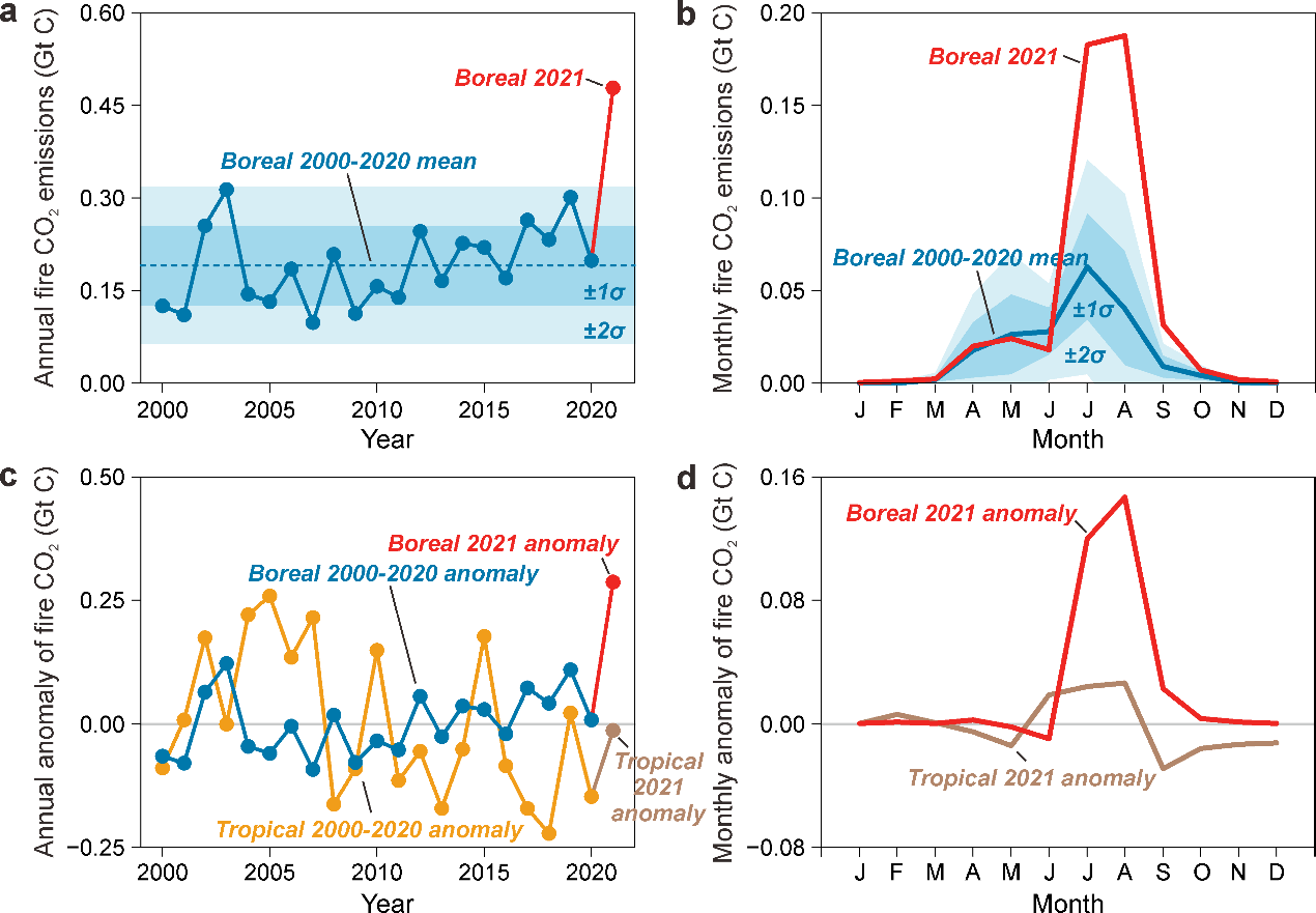 在这一新方法的基础上,团队进一步自主研制了全球野火碳排放近实时量化追踪系统,减少野火碳排放监测的滞后性。“比如说,我们2022年初开展这项研究,当时尚未掌握2021全年的全球野火碳排放数据。如果没有一个动态的、实时更新的碳监测与反演系统,很难快速基于卫星数据开展野火排放监测研究。”基于此,团队研发了这一近实时量化追踪系统,反演量化了2000年至2021年野火二氧化碳排放的时空格局,系统解析了北半球中高纬地区野火(以下简称“北方野火”)2021年创历史新高排放背后的驱动因素,揭示了气候变暖-野火排放之间的正反馈机制与潜在未来风险。