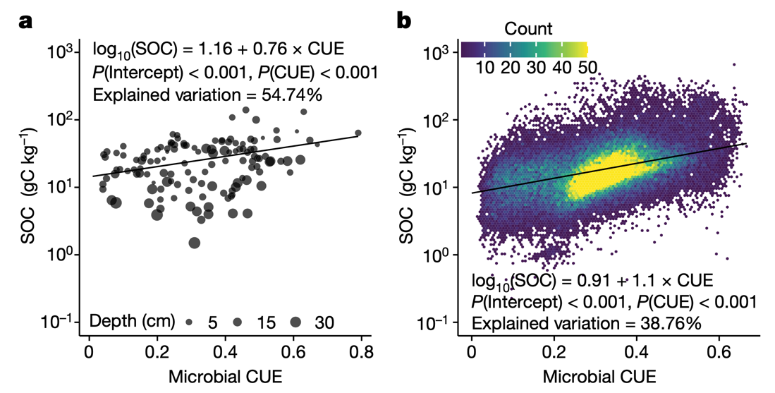 研究团队以微生物碳利用效率为变量,整合了微生物过程对土壤有机碳储存的双重控制机制,探讨了其与全球土壤有机碳储量的关系。结果表明,在全球范围内,微生物碳利用效率与土壤有机碳储量正相关,微生物代谢中对有机合成较高的碳分配比例最终导致了土壤有机碳的积累而不是流失。