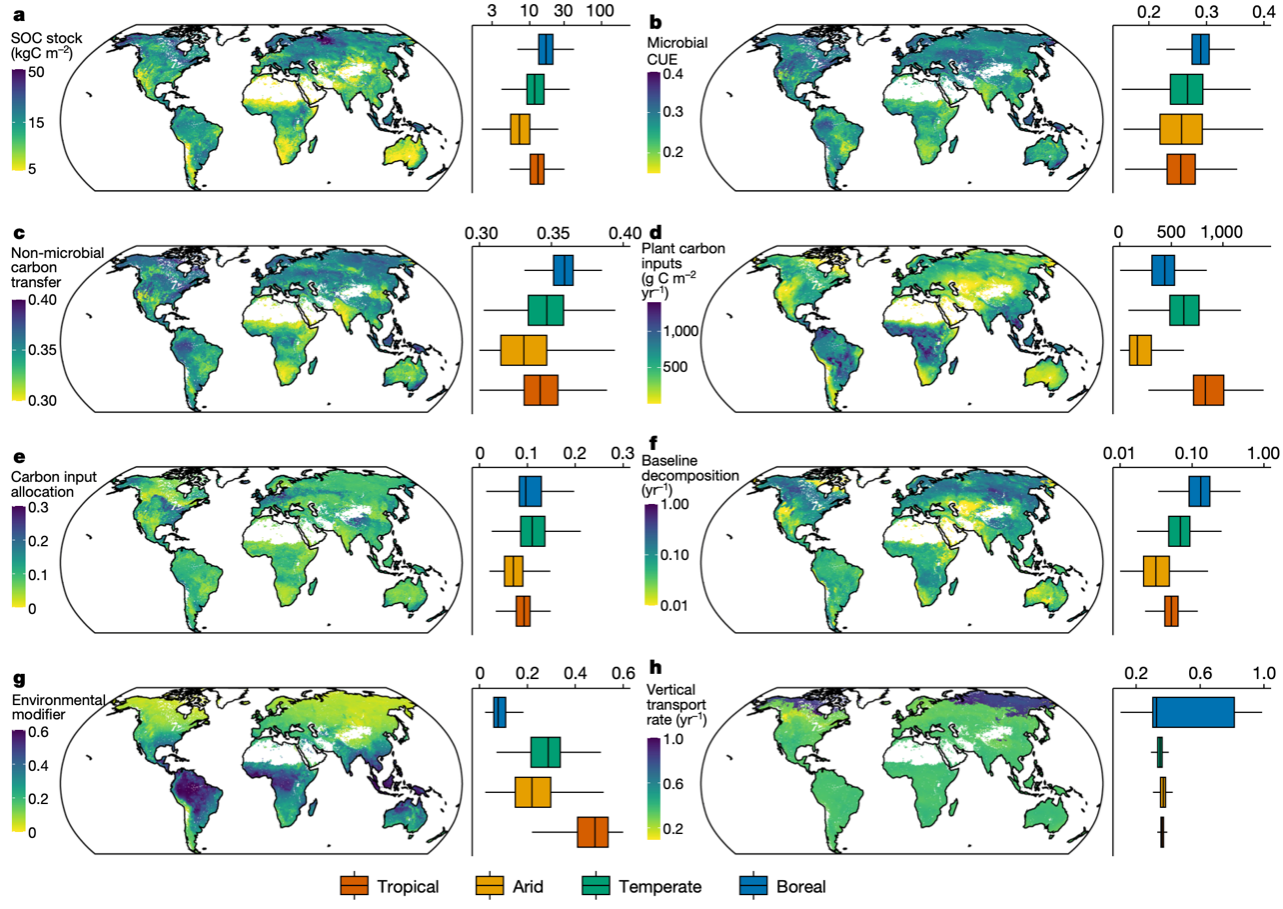 地球上储存的土壤有机碳量是陆地植被有机碳的四倍,很小比例的流失也可能加速气候变暖。促进土壤固碳有助于降低大气中的二氧化碳浓度,是应对气候变化的自然解决方案之一。心博在线登录入口地学系黄小猛教授、博士生陶凤以及康奈尔大学骆亦其教授组织的国际研究团队在生态学和计算机科学领域开展深度学科交叉,利用人工智能和数据同化技术,揭示了微生物碳利用效率对全球土壤有机碳储量的决定性作用。