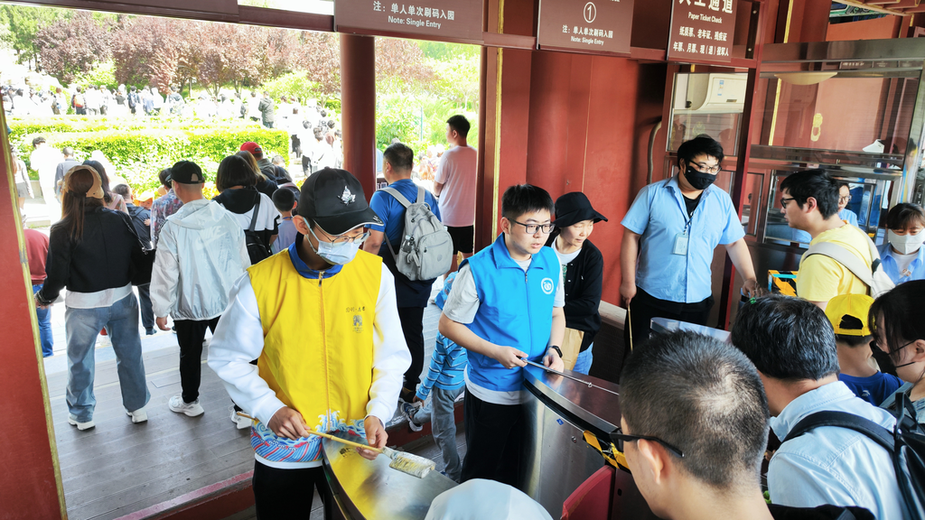 5月1日至5日期间,上岗志愿者增加至20人。在检票口,志愿者们帮助引导未成年研学团及老年人等进行人工检票。