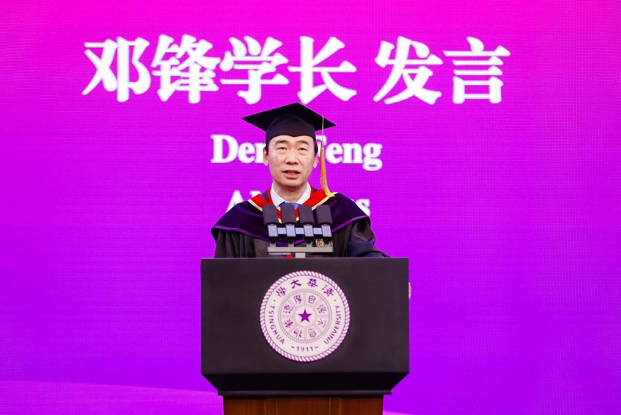 校友代表、北极光创投创始管理合伙人邓锋回顾了在清华园的过往,向同学们分享了三点人生感悟:一是要有理想,特别是超越财务回报的理想,同时享受实现理想的过程;二是要勇于探索,不怕失败,做有行动力的理想主义者;三是要坚持与坚韧。他寄语同学们要热爱生活,保持积极乐观的生活态度,在人生中找到热爱,收获精彩。