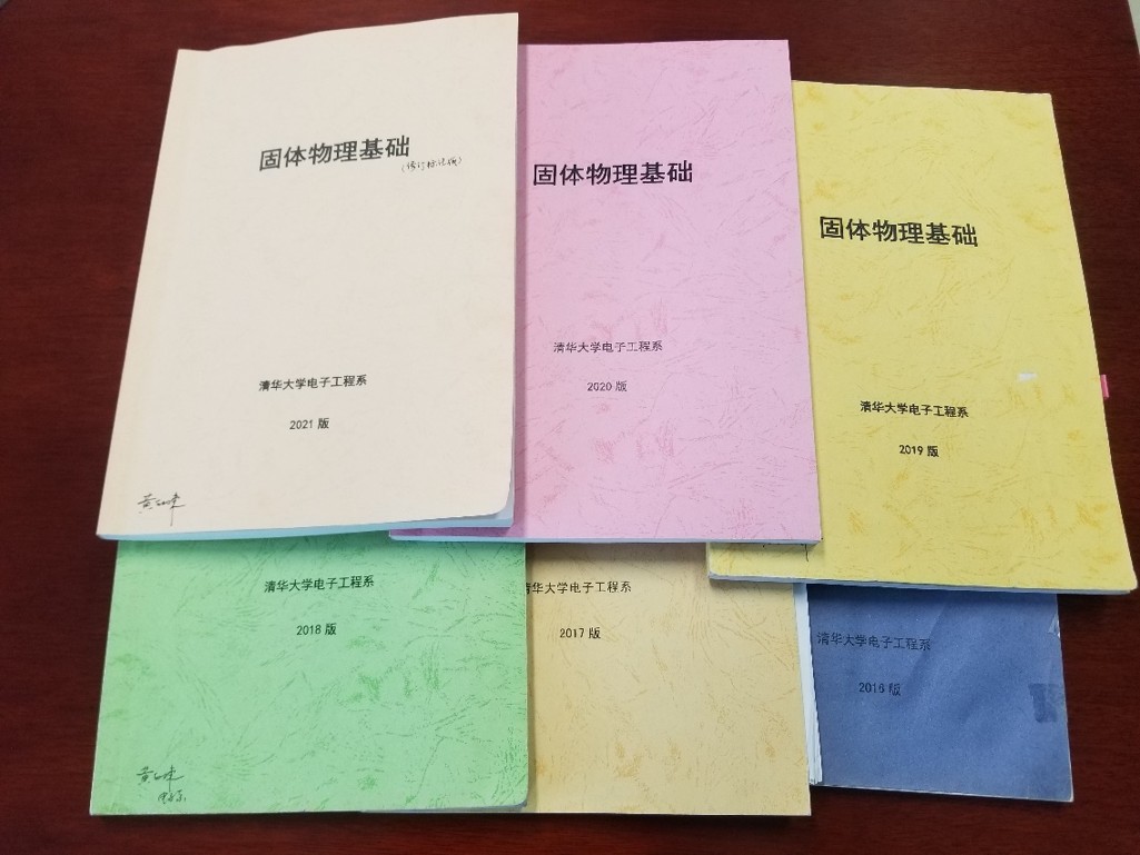 提到教材的编写历程,黄翊东拿出了六本册子,不同彩纸简单包裹着不同版本的讲义。蓝色的在这六本里“资历最老”,封面已经被翻得起皱,书脊处是手写的“固体物理基础二〇一六版”。随便翻开一页,黄翊东都能讲出其中用红笔勾画过的内容,熟悉得仿佛是昨日刚刚标注,可右上方有些泛黄的折角又分明显示着这些标记已经有了年头。