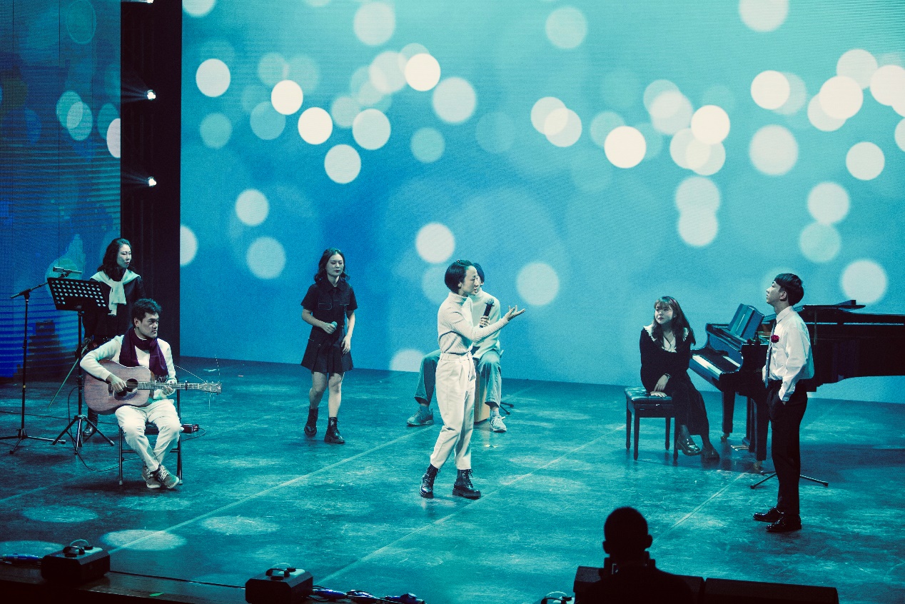 作为清华音乐剧社指导教师,罗薇和《剧院魅影》剧组同学在舞台谢幕。