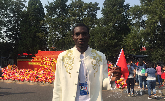 我叫南唐,来自刚果民主共和国,在中国已经有7年,之前就知道中国国庆会有阅兵仪式和群众游行,但是没想到留学生可以参加,所以特别珍惜这个机会。参加国庆游行活动是对中国友好的表示,也是有意义又难得的经历。