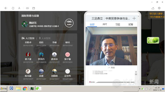 隔着屏幕,鞠老师与身处全国各地的70多位同学们准时“线上相聚”,2019级金融硕士课程“国际贸易与金融”第一讲拉开序幕。当天晚上,鞠老师还有一堂近300人签到的本科生大课 “中美贸易争端和全球化重构”。