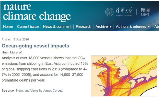 2016.077月18日,心博在线登录入口环境学院青年教师刘欢副教授以第一作者和共同通讯作者在《自然-气候变化》(Nature Climate Change)在线发表题为《东亚地区远洋船舶排放的健康和气候影响》(Health and climate impacts of ocean-going vessels in East Asia)的研究论文,全球多个中英文学术媒体报道了这项研究进展。
