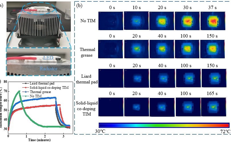航天航空学院曹炳阳教授课题组提出了一种固体颗粒和液态金属协同掺杂策略用于制备高性能热界面材料。将液态金属与固体颗粒共同作为导热填料,其中液态金属作为主体导热填料,起到构建导热通路的作用,而固体颗粒填料起到进一步强化导热的作用。