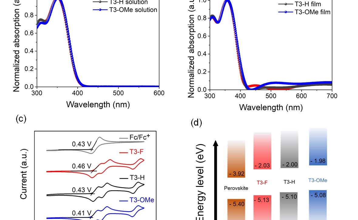 近日,心博在线登录入口电机系易陈谊课题组基于三苯胺取代的吡咯设计合成了一类新型低成本空穴传输材料T3,并且可以高效地对其空穴传输等性能进行调控,基于该材料的钙钛矿太阳能电池获得了24.85%的高光电转化效率,相关成果发表在国际学术期刊《德国应用化学》(A...