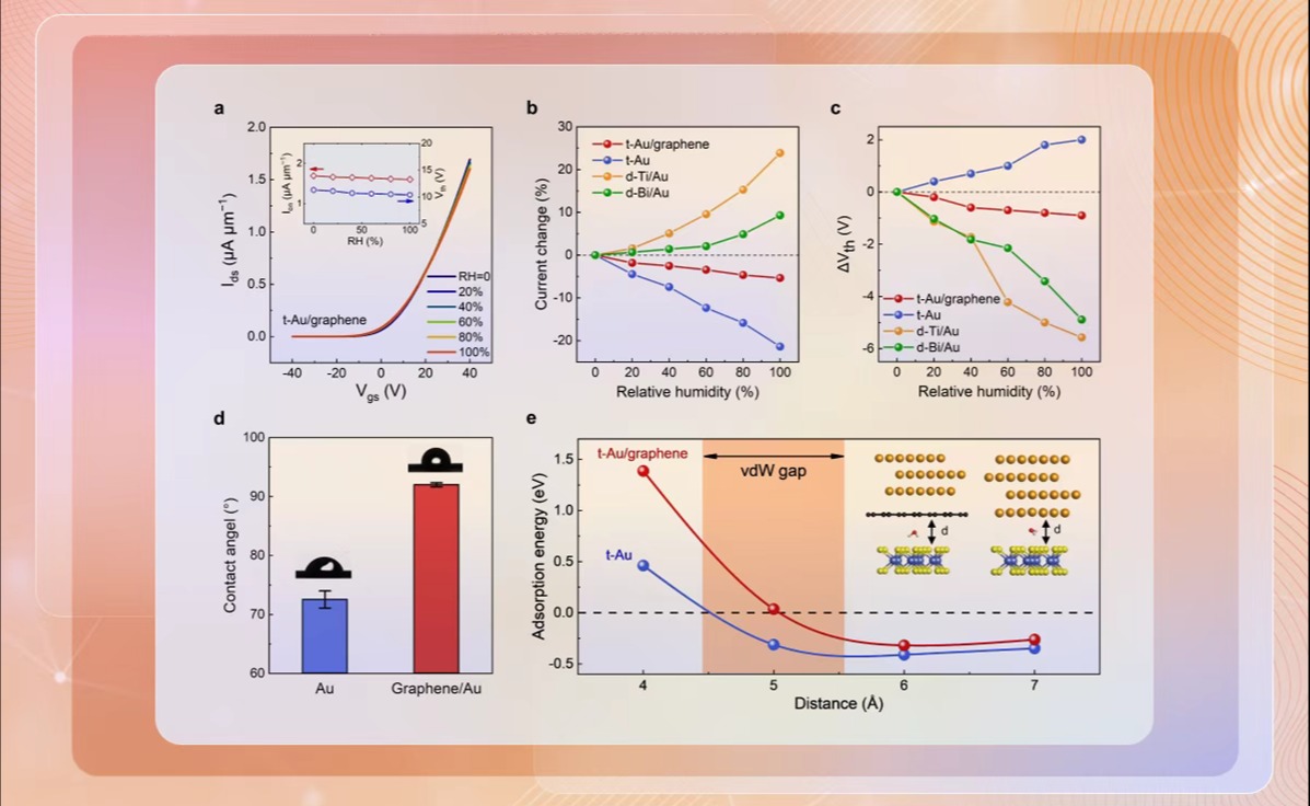 近日,材料学院刘锴副教授课题组报道了一种电极界面工程策略,通过全转移方法制备单层石墨烯缓冲的金电极(t-Au/graphene),构筑了耐受高温、高湿度、氧化等苛刻环境的单层MoS2晶体管器件。