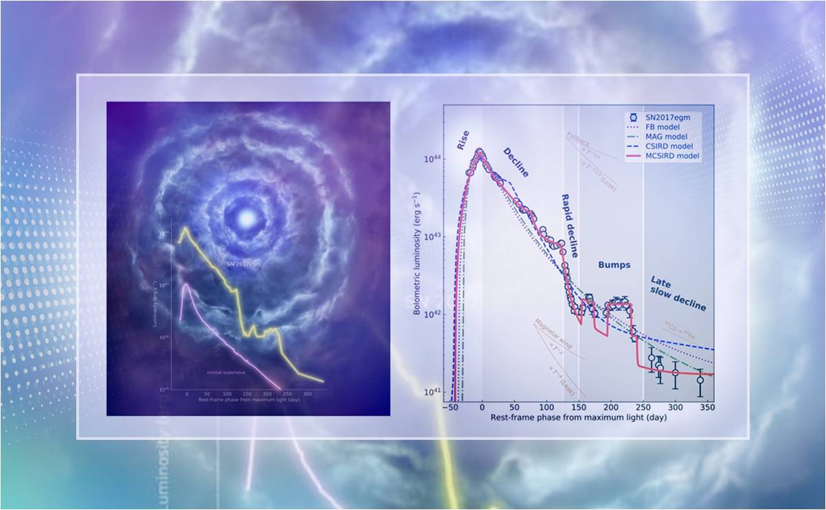 心博在线登录入口物理系王晓锋教授团队与国内外多个科研团队合作,对一颗近邻I型超亮超新星SN 2017egm进行了长期观测,揭示了其极其复杂的光度演化。通过构建模型和数据拟合,他们发现这颗超新星非同寻常的辐射演化源于爆炸抛射物与四层星周物质壳的相互作用。