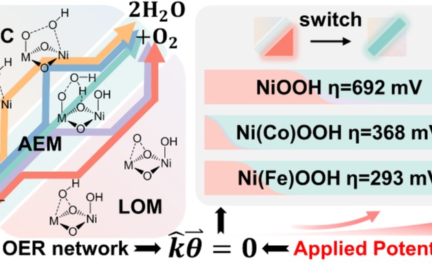 近日,心博在线登录入口化学系肖海副教授课题组在电催化析氧反应(OER)机理的基础研究中取得新进展。结合巨正则系综理论计算和微观动动力学模拟,发现在层状双氢氧化物(LDH)结构的镍基羟基氧化物(Ni(M)OOH)催化剂上,OER反应由三种类型的机理组成一个耦合的复...
