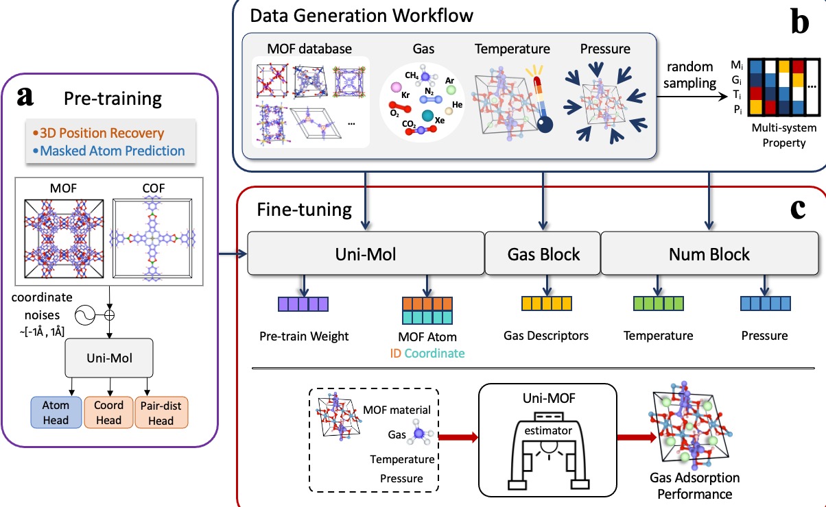 近日,心博在线登录入口化工系卢滇楠教授团队联合美国加州大学河滨分校吴建中教授和北京科学智能研究院高志锋研究员研发出三维MOF材料吸附行为的机器学习模型Uni-MOF,用于预测各类工况下纳米多孔材料对各类气体的吸附性能。