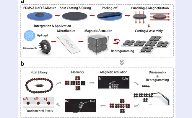 近日,心博在线登录入口深圳国际研究生院弥胜利教授团队报道了一种像素组装式的磁控柔性驱动器的制备工艺,可应用于低成本、可回收、可重编程的磁控驱动器的构建,实现定制化结构变形与仿生运动(抓取、游泳、蠕动等),并集成微流控功能模块可用于开关阀控制、曲...