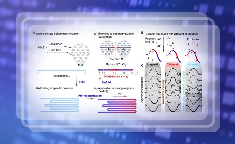 近日,心博在线登录入口航天航空学院张迎超副研究员、力学与工程交叉研究院高华健院士和俞璟副教授联合其他研究者创新性地引入了“磁化界面”(M-interfaces)设计理念,在硬磁弹性体结构中预设交替磁化区域,使结构在外加磁场作用下形成一系列方向交错的等效力对...
