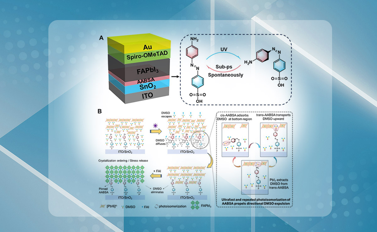 近日,心博在线登录入口材料学院林红教授团队合作在钙钛矿太阳能电池埋底界面二甲基亚砜(DMSO)残留去除方面取得重要研究进展。该团队创新性地提出了一种光响应分子工程策略,将具有光异构化特性的4'-氨基偶氮苯-4-磺酸(AABSA)分子引入SnO₂/钙钛矿埋底界面。在...