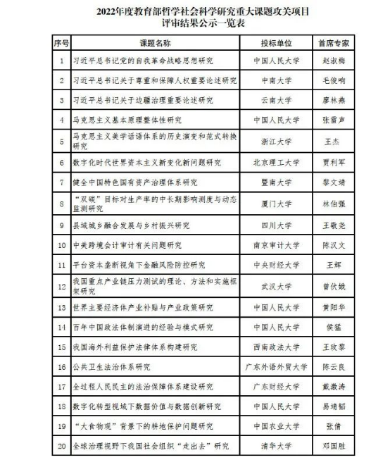 附:2022年度教育部哲学社会科学研究重大课题攻关项目评审结果公示一览表