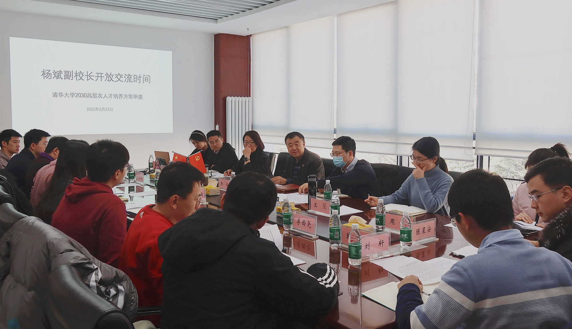 2022年2月22日下午,春季学期开学第一周,副校长、教务长杨斌与来自水利系、化学系、公管学院等10个院系的12名研究生代表,在李兆基科技大楼B347会议室,开展了以“高层次人才培养方案(研究生)举措”为主题的“开放交流时间”(Open Office Hour,简称OOH)活动。同学们在交流中畅所欲言,为学校的研究生教育改革发展提出了宝贵的意见建议。研工部部长赵岑以及研究生院、研工部相关负责人参加活动。